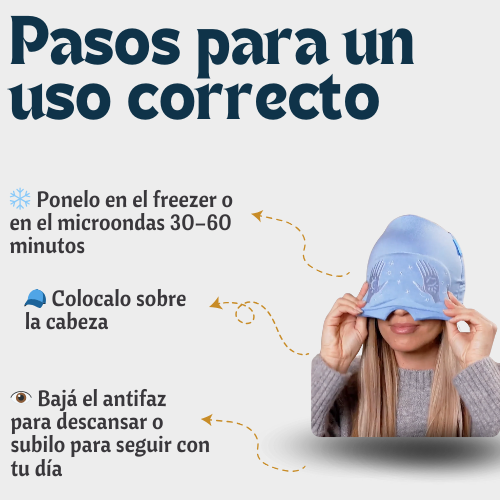 ¿Cómo usar THERAGEL?Usalo cuando aparece la migraña, la presión por pantallas o el estrés del día. El frío calma el dolor y el calor relaja la tensión. Con el antifaz deslizable podés descansar o seguir viendo mientras sentís el alivio.